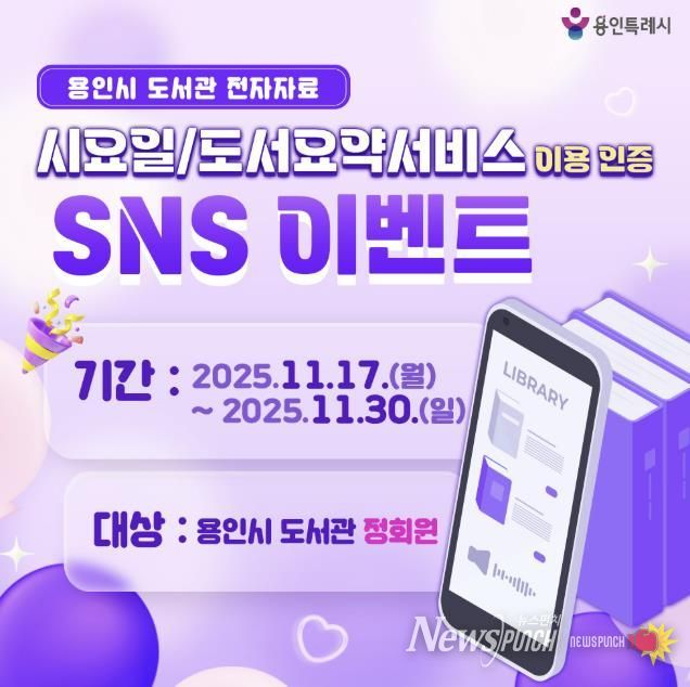 뉴스펀치 김길룡 기자 | 용인특례시는 용인시도서관 전자자료인 시요일과 도서요약서비스 이용자를 대상으로 사회관계망서비스(SNS) 이벤트를 운영한다고 14일 밝혔다.