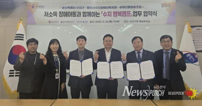뉴스펀치 김길룡 기자 | 용인특례시 수지구는 13일 용인시수지장애인복지관과 수지신용협동조합과 함께 저소득 장애아동의 복지 향상과 장애 인식 개선을 위한 ‘수지 행복캠프’ 추진 업무협약을 체결했다고 14일 밝혔다.
