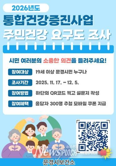 뉴스펀치 김길룡 기자 | 문경시보건소(소장 박애주)는 주민들을 대상으로 17일부터 12월 5일까지 약 3주간 ‘통합건강증진사업 주민요구도 조사’를 한다.