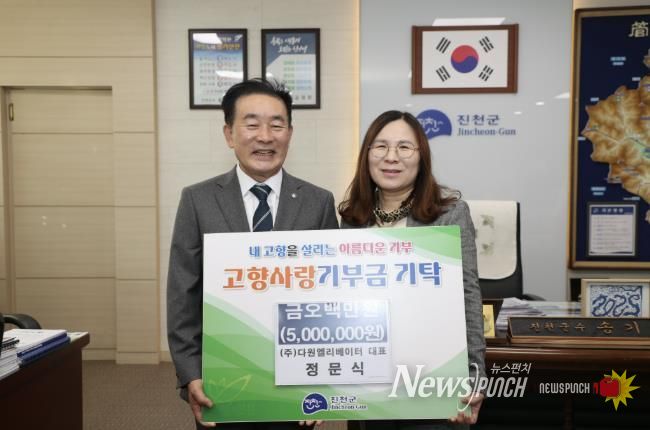 뉴스펀치 김길룡 기자 | 충북 진천군은 14일 다원엘리베이터(주) 정문식 대표와 입센몰 어성란 대표가 진천을 방문해 고향사랑기부금 각 500만원, 200만원을 기탁했다고 밝혔다.