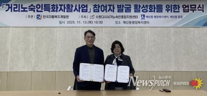 뉴스펀치 김길룡 기자 | 수원시 팔달구 매산동과 수원다시서기 노숙인종합지원센터는 지난 13일, 거리노숙인들의 안정적인 사회 복귀를 지원하기 위해 ‘거리노숙인 특화 자활사업 참여자 발굴 활성화를 위한 업무협약(MOU)’을 체결했다.