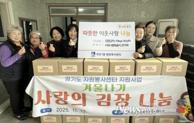뉴스펀치 김길룡 기자 | 수원시 향토음식연구회는 지난 13일, 다가오는 겨울을 맞아 어려운 이웃들의 따뜻한 겨울나기를 돕기 위해 우만1동 행정복지센터에 김치 10kg 30박스를 기부했다.