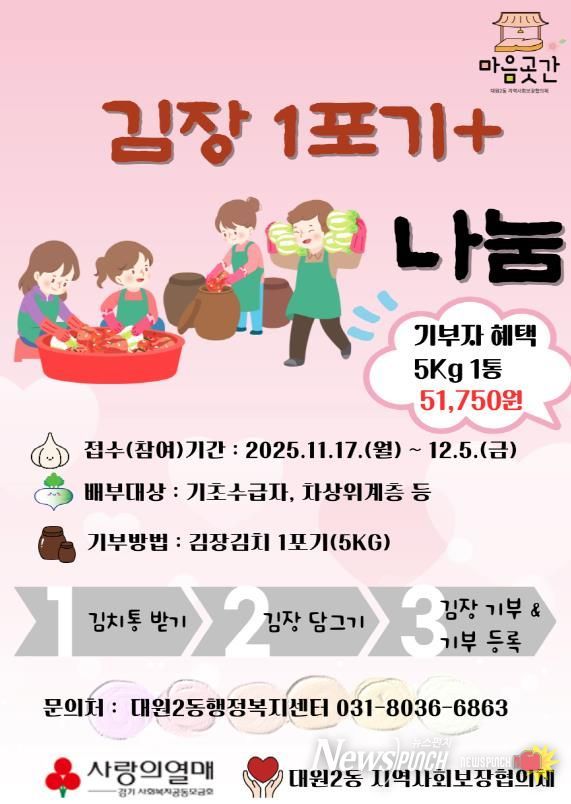 뉴스펀치 김길룡 기자 | 오산시 대원2동지역사회보장협의체는 '2025년 김장 1포기+ 나눔행사'를 오는 17일부터 12월 5일까지 3주간 진행한다고 밝혔다.