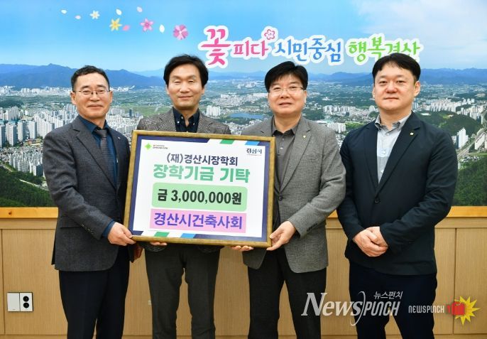 뉴스펀치 김길룡 기자 | (재)경산시장학회는 11월 14일 경산시건축사회(회장 정동국)에서 지역인재 육성을 위한 장학금 300만 원을 기탁했다.