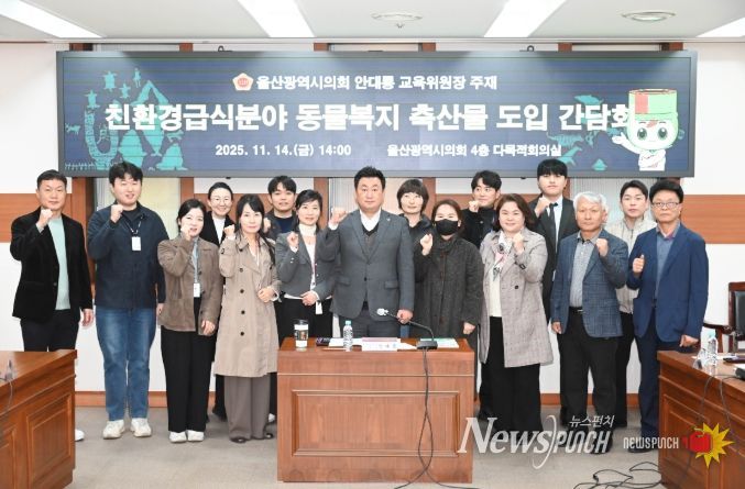 뉴스펀치 김길룡 기자 | 울산광역시의회 교육위원회 안대룡 위원장은 11월 14일 오후 2시, 시의회 4층 다목적회의실에서 ‘친환경급식분야 동물복지 축산물 도입 간담회’를 열고, 울산광역시교육청, 구·군 관계자, 지역 동물복지 인증농가 및 관련 기관들과 울산 학교급식의 지속가능성과 동물복지 강화를 위한 정책 방향을 논의했다.