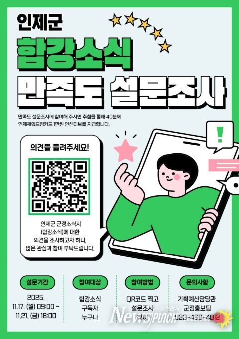 뉴스펀치 김길룡 기자 | 인제군은 군민의 의견을 폭넓게 수렴해 한층 발전된 소식지를 제작하기 위해, 11월 17일부터 21일까지 군정소식지 ‘합강소식’에 대한 만족도 조사를 실시한다.