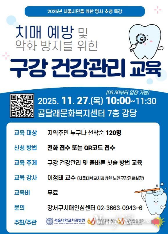 이번 신규 지정을 기념해, 구는 오는 27일(목) 오전 10시 곰달래문화복지센터(강서로5길 50)에서 지역주민 120여 명을 대상으로 ‘치매 예방을 위한 올바른 구강관리’ 특강을 개최한다.