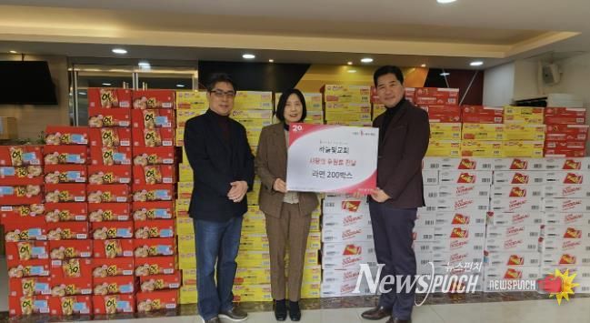 뉴스펀치 김길룡 기자 | 시흥시 월곶동 행정복지센터에 지난 11월 17일 하늘빛교회가 방문해 지역 내 어려운 이웃을 위해 라면 200상자를 기탁했다. 올해도 나눔을 실천한 해당 교회는 지역사회 돌봄 활동에 꾸준히 참여하며 공동체와의 연대를 이어오고 있다.