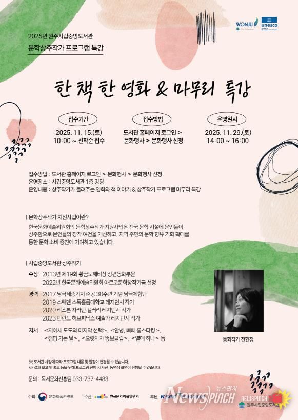 뉴스펀치 김길룡 기자 | 원주시립중앙도서관은 ‘2025년 문학상주작가 지원사업’의 마지막 프로그램으로 상주작가 마무리 특강을 운영한다.