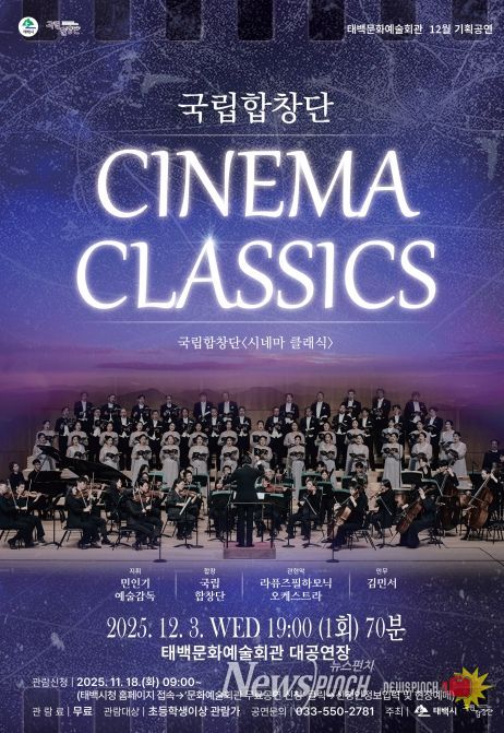 뉴스펀치 김길룡 기자 | 태백시는 오는 12월 3일 태백문화예술회관 대공연장에서 국립합창단 초청 공연 '시네마 클래식'을 선보인다고 밝혔다.
