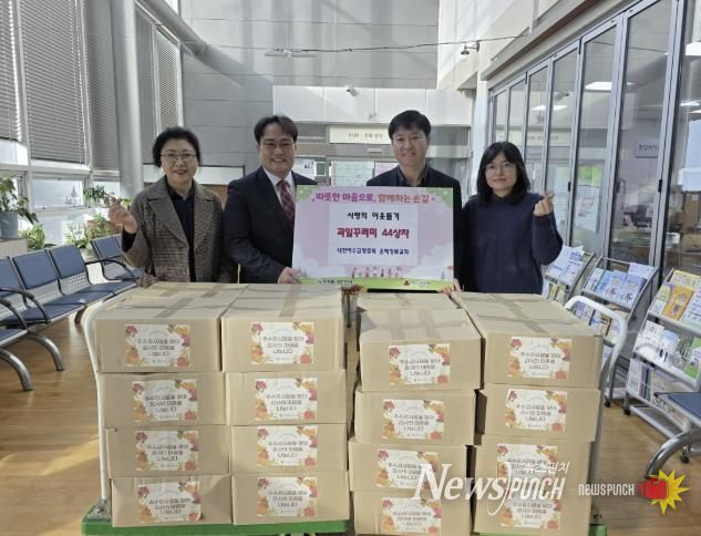 뉴스펀치 김길룡 기자 | 의왕시는 대한예수장로회 은혜장로교회가 11월 17일, 추수감사주일을 맞아 성도들이 준비한 사랑의 과일 꾸러미 44상자를 부곡동주민센터에 전달했다고 밝혔다.