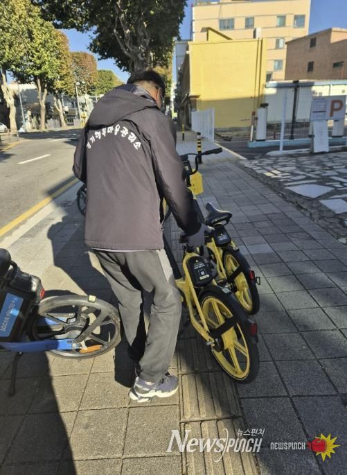 뉴스펀치 김길룡 기자 | 수원시 팔달구 행궁동 경기행복마을관리소는 행궁동 일대를 순찰하며 무질서하게 방치된 공유자전거와 공유킥보드를 정비·이동시키는 환경정비 활동을 꾸준히 실시하고 있다.