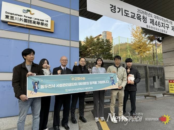 뉴스펀치 김길룡 기자 | 동두천시 시설관리공단은 11월 13일 2026학년도 대학수학능력시험을 마치고 시험장을 나오는 수험생들을 격려하기 위해 동두천외국어고등학교 앞에서 ‘수고했수능’ 응원 행사를 진행했다.