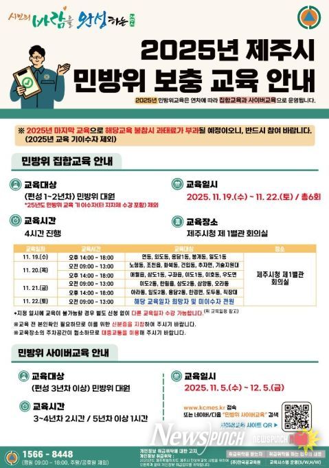 뉴스펀치 김길룡 기자 | 제주시는 11월 5일부터 오는 12월 5일까지 2025년 민방위 교육 미이수자 2,400여 명을 대상으로 올해 마지막 보충교육을 실시하고 있다.