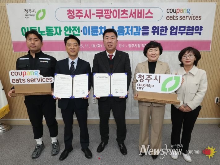 뉴스펀치 김길룡 기자 | 청주시는 18일 이동노동자의 안전 확보 및 이륜차 소음 저감을 위해 쿠팡이츠서비스(유)와 업무협약(MOU)을 체결했다.
