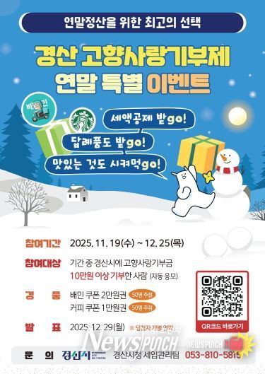 뉴스펀치 김길룡 기자 | 경산시는 11월 19일부터 12월 25일까지 고향사랑기부제 연말 특별 이벤트를 진행한다고 밝혔다.