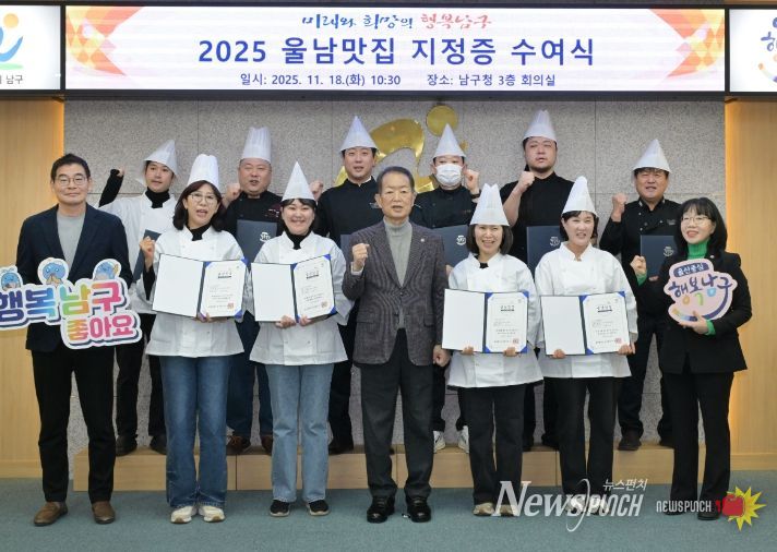 뉴스펀치 김길룡 기자 | 울산 남구는 18일 남구청 3층 회의실에서‘2025 울남 맛집 지정증 수여식’을 열고 먹거리 관광 활성화에 나섰다.