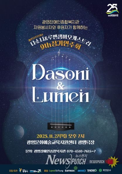 뉴스펀치 김길룡 기자 | 광명장애인종합복지관은 개관 25주년을 맞아 오는 11월 27일 오후 7시, 광명극장에서 ‘다소니&루멘챔버오케스트라 제9회 정기연주회’를 개최한다. 이번 연주회는 복지관을 위해 꾸준히 후원과 자원봉사를 실천해온 후원자와 자원봉사자를 초청해, 장애인 예술가의 무대를 함께 즐기는 감사의 자리로 마련됐다. 복지관은 이번 행사를 통해 지역사회가 장애예술을 보다 가까이 경험하고, 문화예술을 매개로 한 긍정적 인식 변화가 확산되기를 기대하고 있다.