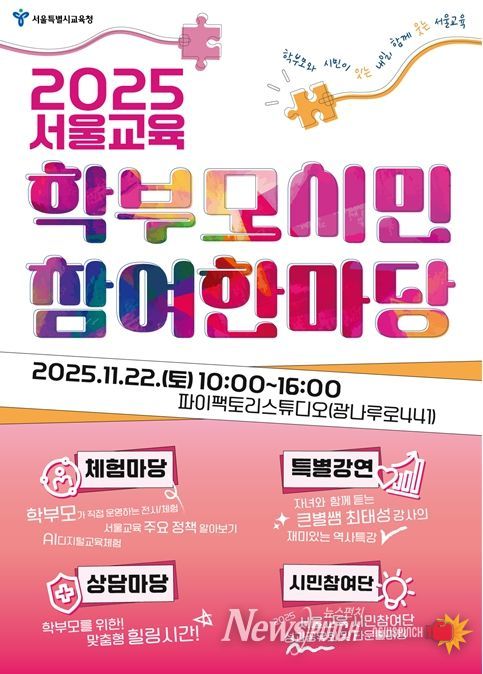 뉴스펀치 김완규 기자 | 서울특별시교육청은 ‘학부모와 시민이 잇는 내일, 함께 웃는 서울교육’을 슬로건으로 '서울교육 학부모․시민 참여 한마당'을 11월 22일 오전 10시부터 오후 4시까지 광진구 파이팩토리 스튜디오(광진구 광나루로 441)에서 개최한다.