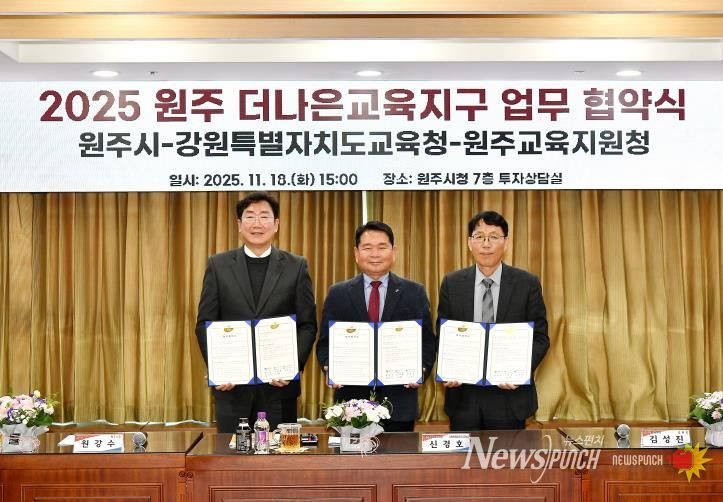 뉴스펀치 김길룡 기자 | 원주시는 지난 18일 시청 7층 투자상담실에서 ‘원주 더나은교육지구’ 지정 연장 업무협약을 체결했다. 협약식에는 원강수 원주시장, 신경호 강원특별자치도 교육감, 김성진 원주교육지원청 교육장이 참석했다.