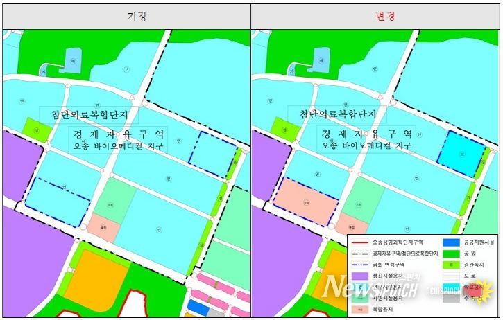 뉴스펀치 김길룡 기자 | 충북도는 11월 17일 오송첨단의료복합단지의 토지이용계획을 변경하는 개발실시계획이 승인됐다고 밝혔다. 이를 통해 오송읍 연제리 682-2, 682-3은 연구시설용지에서 복합용지로, 연제리 657은 연구시설용지에서 학교시설용지로 변경된다.