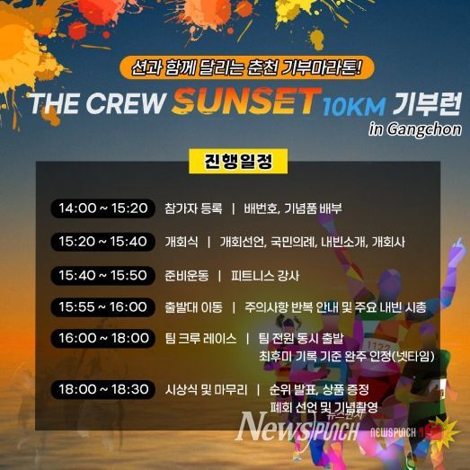 기부 러닝 행사인 ‘더 크루 선셋 10KM 기부런’이 오는 22일 강촌 북한강 일원에서 열린다. 전국 곳곳의 러닝 크루들은 엘리시안강촌 리조트에서 출발해 백양리역 입구를 지나 북한강변을 따라 펼쳐진 코스를 왕복하며 가을빛으로 물든 강촌을 함께 달린다. 참가자들은 완주와 함께 1인당 1만 원씩 기부해 나눔을 실천한다.