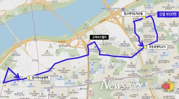 뉴스펀치 김완규 기자 | 서울 강동구는 출근시간대 교통 혼잡 완화를 위한 ‘출근시간 맞춤버스’, 일명 ‘다람쥐버스’ 8333번 노선이 신설됐다고 밝혔다. 8333번 버스는 오는 12월 8일(월)부터 운행할 예정이다.