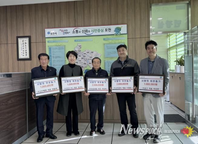 뉴스펀치 김길룡 기자 | 포천시 가산면은 지난 18일, 관내 5개 기업체 ㈜우림섬유, ㈜고려금속, ㈜로고, ㈜유진씨엔씨(CNC), ㈜신진메탈이 총 700만 원의 성금을 가산면행정복지센터와 가산면노인회분회에 전달했다고 밝혔다.