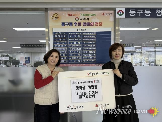 뉴스펀치 김길룡 기자 | 구리시 동구동 행정복지센터는 지난 18일 동구동 행정복지센터 대회의실에서 '내 남은 인생은 골프와 함께' 모임으로부터 관내 취약계층 청소년을 위한 장학금 70만 원을 기탁받았다고 밝혔다.
