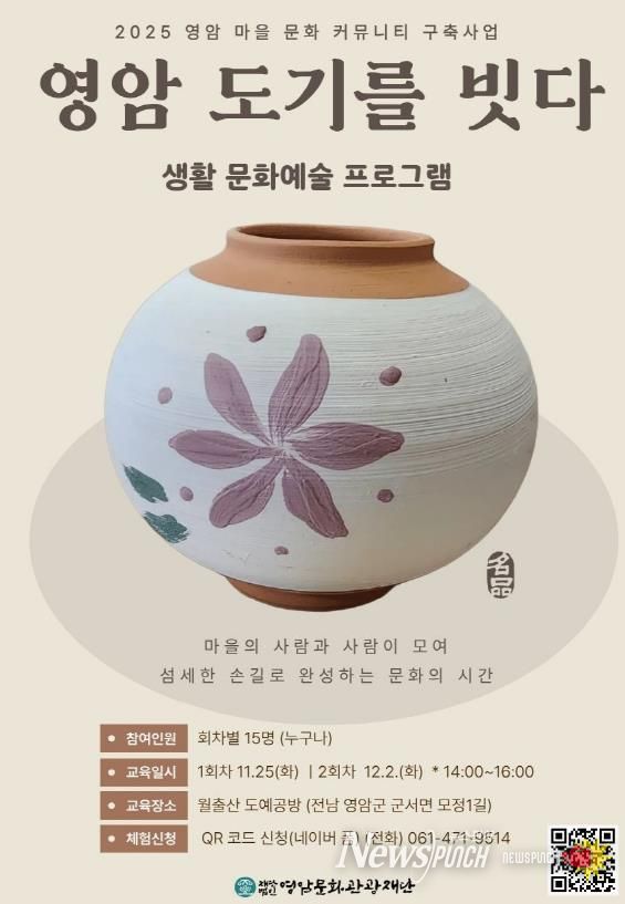 뉴스펀치 김길룡 기자 | (재)영암문화관광재단은 오는 11월 25일 오후 2시부터 4시까지, 영암군 군서면 모정마을에 위치한 월출산도예공방(대표 정수미)에서 지역민과 함께하는 생활문화 예술 프로그램인‘영암 도기를 빗다’를 개최한다.