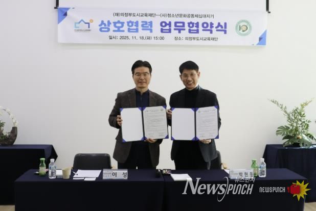 뉴스펀치 김길룡 기자 | 의정부도시교육재단은 지난 11월 18일, 사단법인 청소년문화공동체 십대지기와 위기청소년을 조기에 발굴하고 지원하기 위한 업무협약(MOU)을 체결했다.