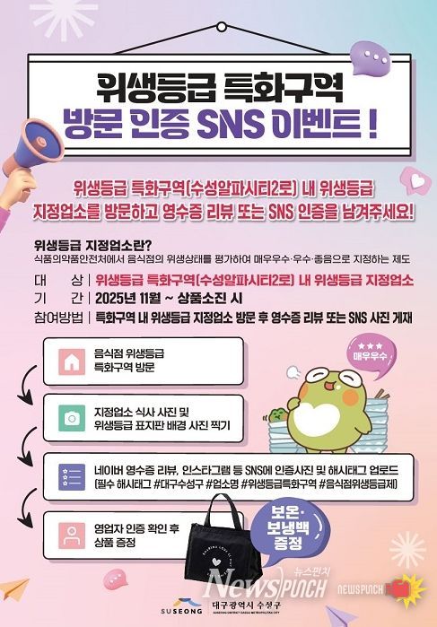 뉴스펀치 조평훈 기자 | 대구 수성구는 ‘위생등급 특화구역 방문 인증 SNS 이벤트’를 실시한다고 밝혔다.