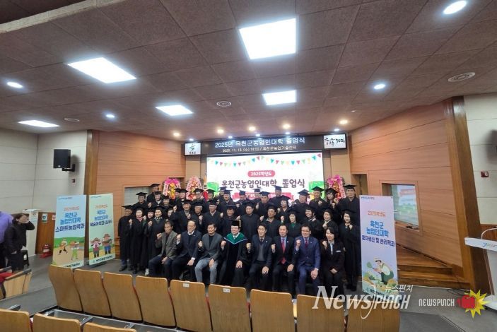 뉴스펀치 김길룡 기자 | 옥천군은 19일 농업기술센터 농업인교육관에서 옥천군 농업의 미래를 이끌어갈 농업전문인력을 양성하는 2025학년도 옥천군농업인대학 졸업식을 성황리에 개최하고, 총 43명의 전문 농업인을 배출했다.