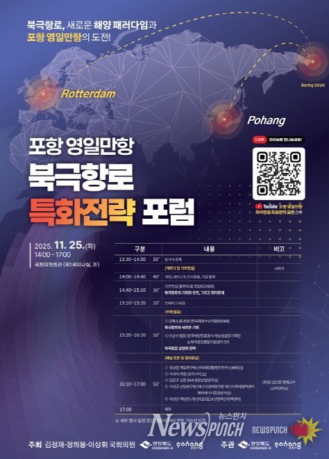 한편 포럼은 유튜브(YouTube)에서 실시간 중계될 예정이며, ‘포항 영일만항 북극항로 특화전략 포럼’ 검색 또는 QR 코드 스캔으로 누구나 시청할 수 있다.
