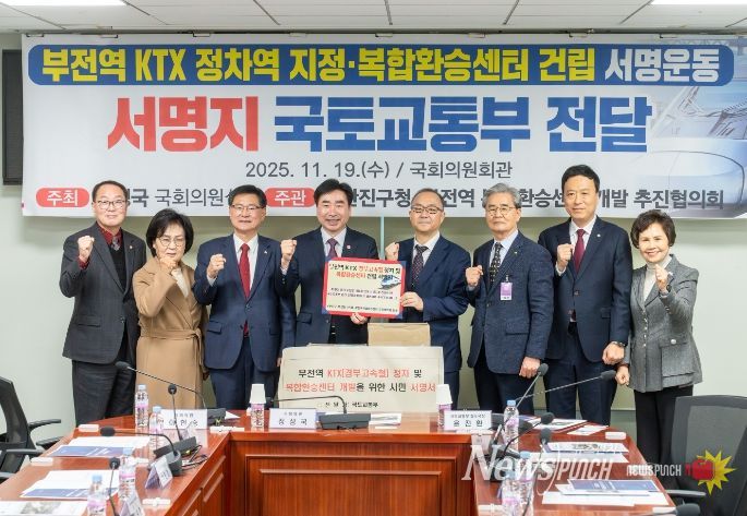 뉴스펀치 김길룡 기자 | 부산진구는 부전역을 KTX(경부고속철도) 정차역으로 지정하고 복합환승센터를 조속히 건립하고자 하는 지역주민의 뜻을 전달하기 위해 11월 19일(수) 오전 11시 서울 여의도 국회의원회관에서 서명운동 결과 전달 행사를 개최했다고 밝혔다.