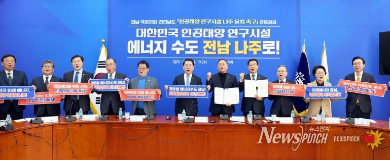 뉴스펀치 김길룡 기자 | 전라남도는 19일 국회에서 지역 현안 해결과 인공태양 연구시설 유치를 위해 ‘전남 국회의원-전남도 정책협의회’를 개최하고, 이어 광주 국회의원들과도 공동결의문을 발표하며 한목소리로 유치 결의를 다졌다고 밝혔다.