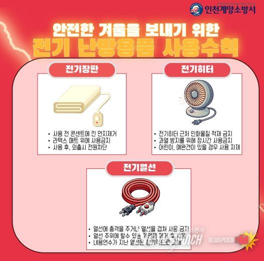 뉴스펀치 김길룡 기자 | 계양소방서는 본격적인 겨울철을 앞두고 난방기기 사용이 증가함에 따라 전기장판·전기히터·전기열선 등 전기 난방용품의 안전사용 수칙을 집중 홍보한다고 19일 밝혔다.