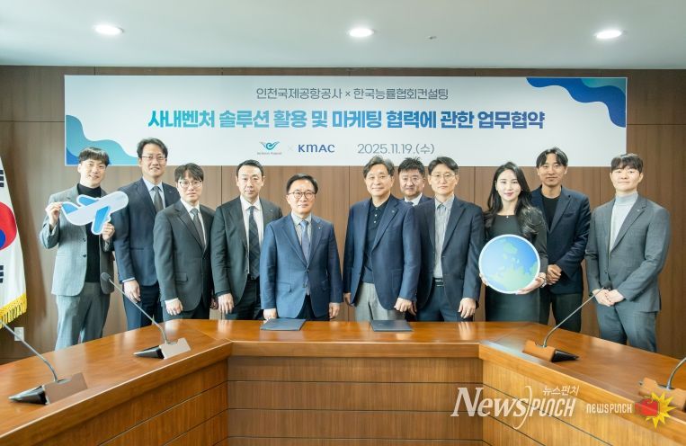 뉴스펀치 김길룡 기자 | 인천국제공항공사(사장 이학재)는 19일 오전 공항청사 회의실에서 한국능률협회컨설팅(KMAC)과 ‘인천공항 사내벤처 솔루션* 활용 및 마케팅 협력을 위한 업무협약(MOU)’을 체결했다고 밝혔다.