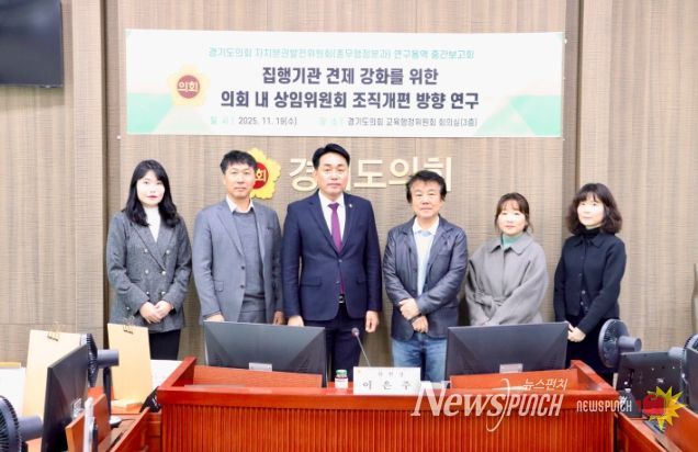 뉴스펀치 김길룡 기자 | 경기도의회 자치분권발전위원회 총무행정분과 이은주 위원장(국민의힘, 구리2)은 11월 19일, 「집행기관 견제 강화를 위한 의회 내 상임위원회 조직개편 방향 연구」 중간보고회를 주재했다. 이번 회의는 지난 9월 29일 열린 착수보고회 이후 연구 추진 경과를 점검하고, 향후 연구 방향을 구체화하기 위해 마련됐다.