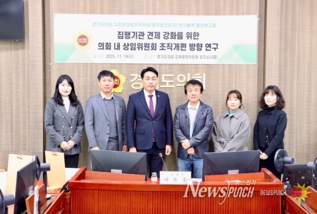 뉴스펀치 김길룡 기자 | 경기도의회 자치분권발전위원회 총무행정분과(위원장 이은주)는 11월 19일 도의회 교육행정위원회 회의실에서 '집행기관 견제 강화를 위한 의회 내 상임위원회 조직개편 방향 연구' 중간보고회를 개최하며, 향후 의원 정수 확대와 정책 환경 변화에 대응하기 위한 상임위원회 재구조화 방안을 논의했다.