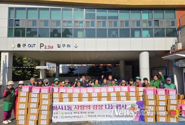 뉴스펀치 김길룡 기자 | 하남시 미사1동 새마을협의회(회장 김성호)와 부녀회(회장 유정자)는 2025년 11월 19일, 본격적인 겨울을 맞아 관내 소외계층 100가구에 전달할 ‘사랑의 김장김치 나눔 행사’를 성황리에 진행했다.