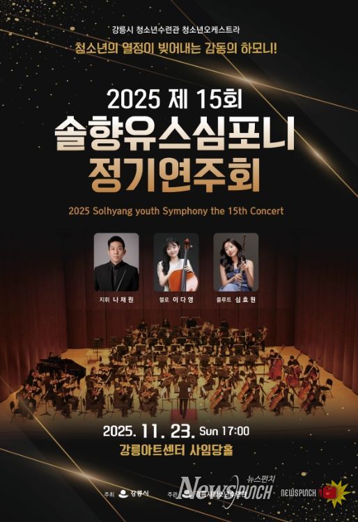뉴스펀치 김길룡 기자 | 강릉시 청소년수련관은 오는 11월 23일 오후 5시부터 6시 30분까지 강릉아트센터 사임당홀에서 ‘제15회 강릉시 청소년오케스트라 솔향유스심포니 정기연주회’를 개최한다.