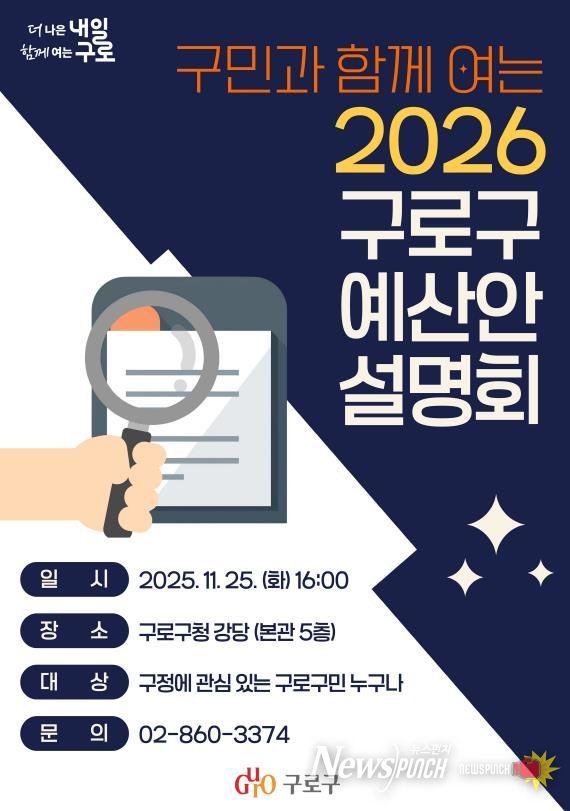 뉴스펀치 김완규 기자 | 구로구가 11월 25일 오후 4시 구로구청 5층 강당에서 ‘구민과 함께 여는 2026년 구로구 예산안 설명회’를 연다.