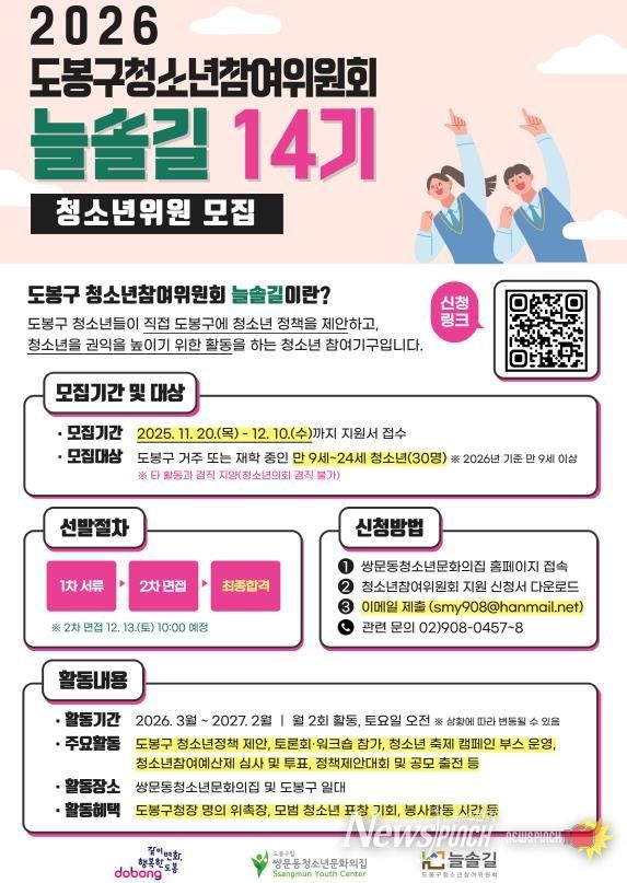 뉴스펀치 김완규 기자 | 서울 도봉구가 제14기 ‘도봉구 청소년참여위원회’ 위원 30명을 공개 모집한다.