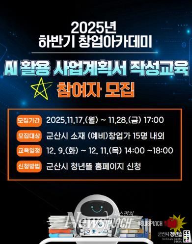 뉴스펀치 정홍균 기자 | 군산시 청년뜰 창업센터는 28일까지 정부지원사업대비 사업계획서를 준비 중인 군산시 (예비)창업자를 대상으로 ‘2025년 하반기 창업아카데미 인공지능(AI) 활용 사업계획서 작성교육’ 참여자를 모집한다.