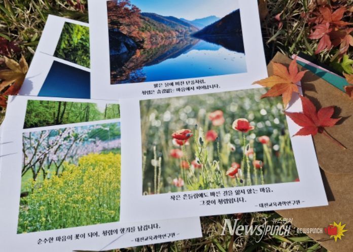 뉴스펀치 김길룡 기자 | 대전시교육청 대전교육과학연구원은 11월 21일부터 23일까지 기관장이 직접 촬영한 사진으로 제작한 ‘청렴엽서’를 배포해 교직원과 학생 및 학부모, 인근 유관기관과 함께하는 감성 청렴캠페인을 추진한다고 밝혔다.