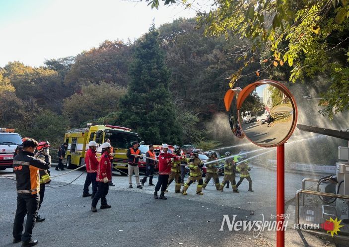 특히 이번 훈련에서는 산불 기계화시스템(이동식 저수조·펌프·호스 등)을 활용해 산림 내 급수·방수 능력을 점검했으며, 이동식 저수조를 현장에 설치해 진화거점을 중심으로 한 실전형 진압훈련을 실시했다. 이를 통해 산악 지형에서의 수원 확보 체계와 장비 연계 운용 능력을 실제 상황처럼 검증했다.