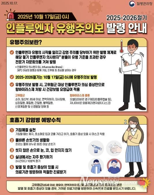 뉴스펀치 김길룡 기자 | 공주시는 최근 예년보다 빠른 시기에 인플루엔자 환자가 증가함에 따라 전국적으로 인플루엔자(독감) 유행주의보가 발령돼 예방접종과 개인 위생수칙 준수가 그 어느 때보다 중요한 상황이라고 밝혔다.
