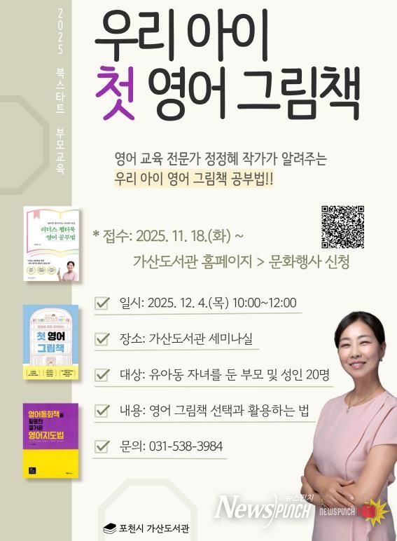 뉴스펀치 김길룡 기자 | 포천시는 오는 12월 4일 가산도서관에서 ‘우리 아이 첫 영어 그림책’을 주제로 2025 북스타트 부모교육을 운영한다.