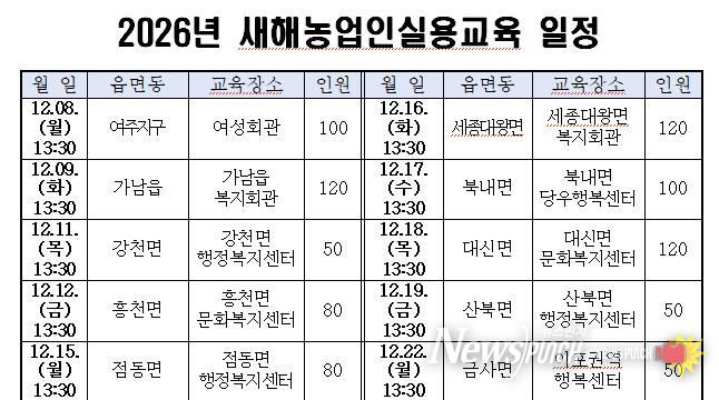 뉴스펀치 김길룡 기자 | 여주시는 오는 2025년 12월 8일부터 12월 22일까지 총 10회에 걸쳐 진행하는 녪년 새해농업인실용교육’을 추진한다고 밝혔다.